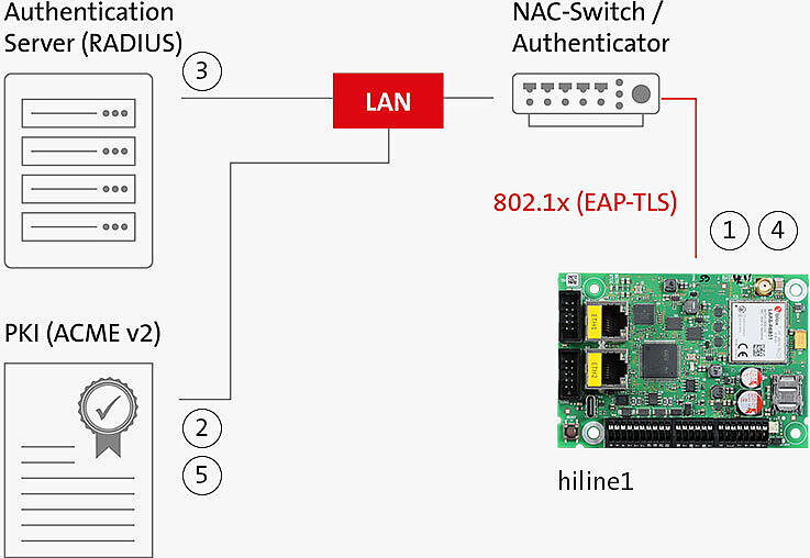 Die Sicherheitslösung NAC (Network Access Control) sorgt für Sicherheit und Zugriffsregeln innerhalb eines Netzwerks. Sie wird von der Übertragungseinrichtung hiline1 (ETH/LTE NAC) unterstützt und arbeitet nach dem Authentifizierungsverfahren IEEE 802.1x. Dabei nutzt sie mit der EAP-TLS Methode den höchsten Sicherheitsstandard.